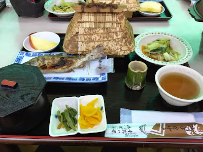 遊覽完高千穗峽谷,午餐安排在高千穗峽谷附近用膳-黑豚陶板燒,領隊已預約時間,每份午餐已安放在坐位上,步坐下侍應手拿竹筒並說道:sa ken… sa ken翻開桌上竹筒杯,熱烘烘嘅清酒倒進杯內,配合室外霧雨潮濕的氣溫,清酒好美味,過後,侍應又說:wu tou…wu tou熱烘烘的烏冬隨手奉上,峽谷原始森林的智慧,用竹葉製成器皿蒸蔬菜番薯、蘿蔔,那條魚他們說是剛打撈上來新鲜即燒的,陶瓷鍋內是黑豚肉,木漆碗盛載白飯